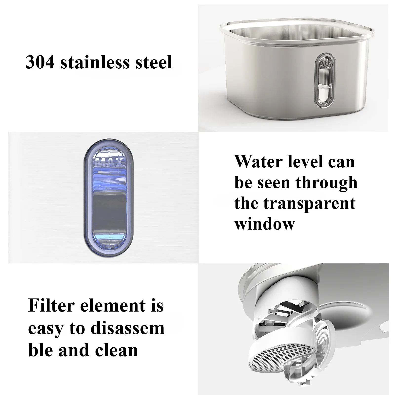 1. 304 Stainless Steel: The cat water fountain is made of 304 stainless steel, and more durable and corrosion resistant. BPA-free and dishwasher safe, easy to clean.