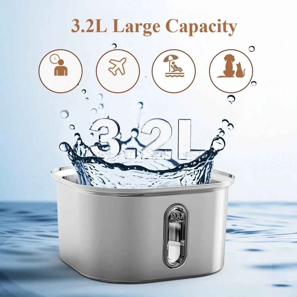 3. 3.2 L/108 Oz Large Capacity: The capacity of water fountain is 3.2L, and the high and low water level lines are marked in the container, and the effective volume is more than 3L, very suitable for multi-pet families.